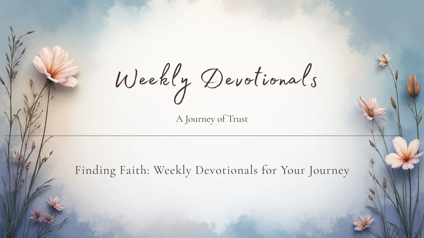 A soft blue and white background with pink flowers along the left and right sides. The text reads "Weekly Devotionals: A Journey of Trust. Finding Faith: Weekly Devotionals for Your Journey."